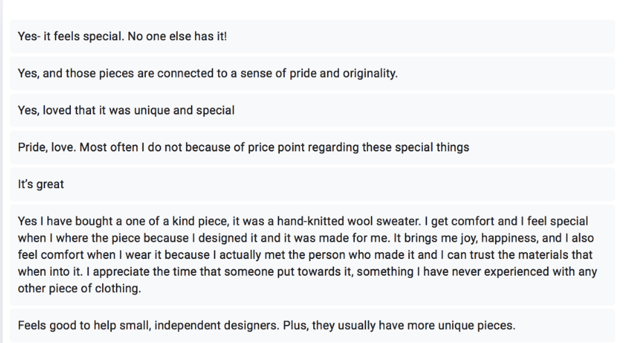 Social cooperation and connective thinking is important to recognize in order to foster interaction and exchange among individuals and communities. This connection is imperative to have within the industry and it is necessary to sustain interaction both in the research and design practices of every industry. For example, using tools and techniques for participatory design opens participants to one another. In these times, the networking tools we have available to us in order to sustain interaction among individuals and communities is mainly through digital platforms. All interviews for this paper were conducted online, opening conversations of where participants see connectivity in fashion and of how authentic collaboration is necessary. This is an ongoing research project that will continue into activities like furthering conversations, workshops and focus groups, and participatory design sessions to understand how codesign and education of the involvement of people can take a global effect. Participants will engage indirectly with qualitative materials and design artifacts. In this paper the data describes the results of an analysis based on the importance of connective values. Through this collaborative research, many different perspectives and cultures will be coming together. Seven interviews were conducted with multiple age groups, genders, as well as international and local participants. The conversations were conducted individually for twenty minutes, over virtual platforms. Also, a survey was conducted with 30 participants where questions were asked that compelled participants to think about their personal wardrobes and habits, specifically having them reflect on what it means to them to have a one of a kind garment. (see figure one for a portion of the responses) These questions alluded to how we can create codesign within this system, and through the responses I gained insights of how through our global society we can create programs of connectivity to transform and create authentic collaborations between the designer and the consumer, the citizens and the supply chain. The following are samples of some of the responses regarding a unique garment that the survey participants owned.