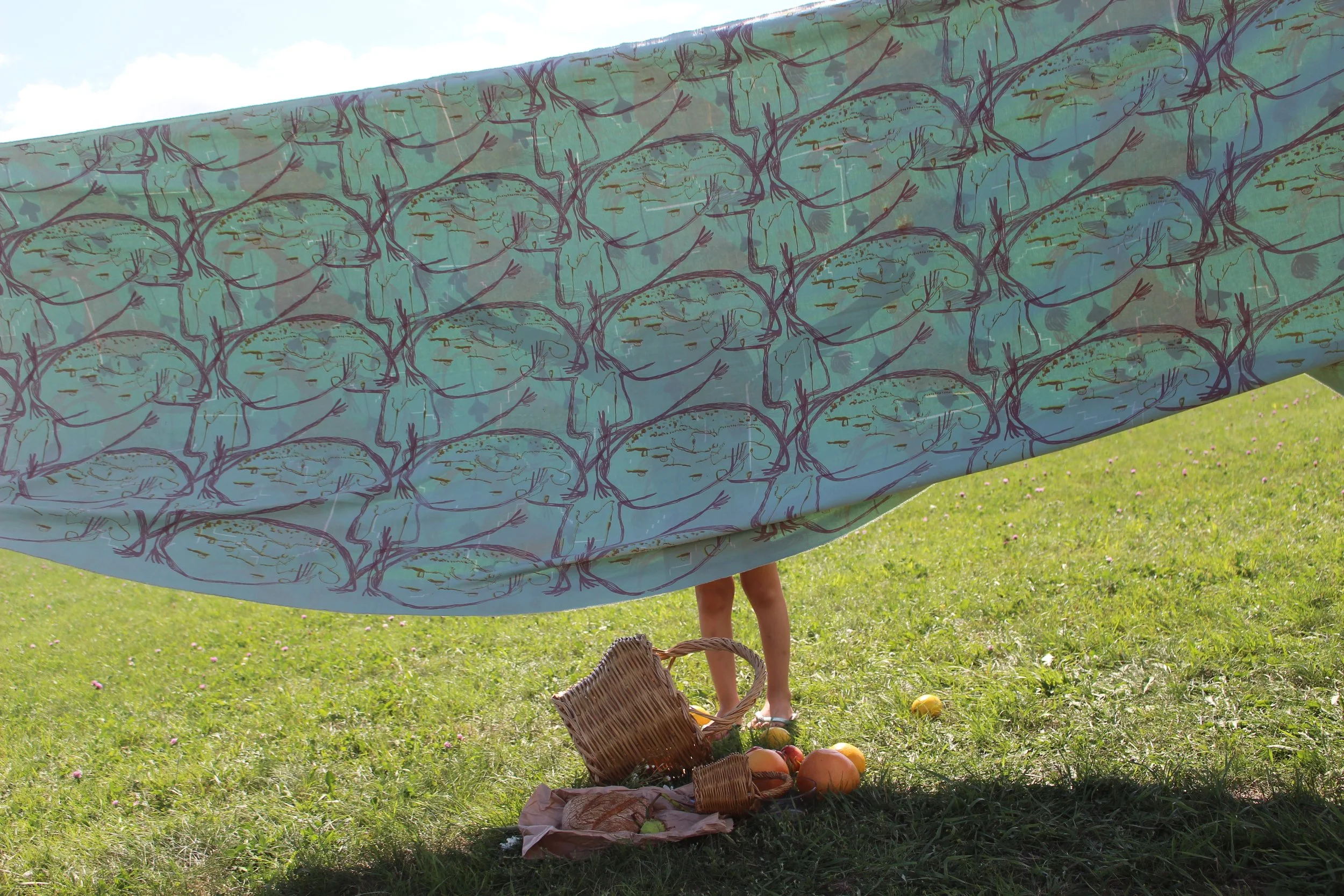 A space created to share food with both sides of the printed picnic blanket representing the cultivation and preservation of tradition through the sharing of a meal.